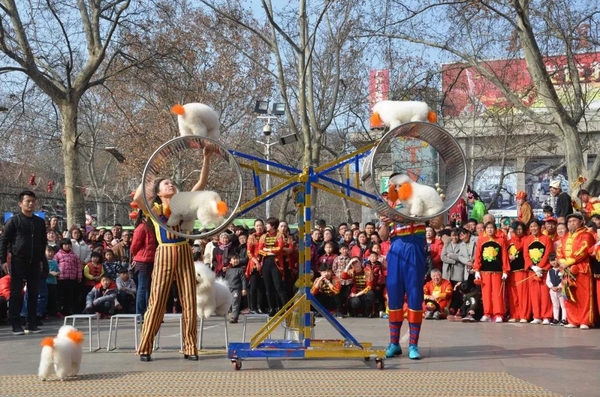 表演中,《中州大鼓》敲出新年满堂彩;《舞龙》、《舞狮》舞出吉祥好喜气;《闹社火》中毛驴、旱船齐舞动,一派喜气洋洋;《武高跷》扭出喜乐新春的“高”节奏;平均年龄在六十五岁以上的《抖空竹》老年队,展示出别样的夕阳之美、运动之乐;登上2018央视春晚的训狗师乔麦元和他的狗狗们也到场助力添彩,狗狗们憨态可掬、呆萌讨巧的演出,逗得在场观众开怀大笑;商场特别邀请到的毛泽东、蒋介石、宋庆龄等几位特型演员的情景演出,为大家带来仿若穿越历史的感受。他们还频频与现场观众互动,引得广大市民热情点赞,争着抢着要与他们合影留念。