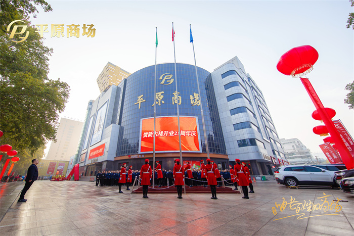 10月29日清晨,朝阳初露。商场北广场,国旗店旗在国歌声中同步升起。员工仰望旗帜,仿佛望见1957年商场的木柜台,1999年的烂尾楼和2000年新大楼开业时万众瞩目的欢呼……几代平原人的记忆,在这一刻,凝练成具象。